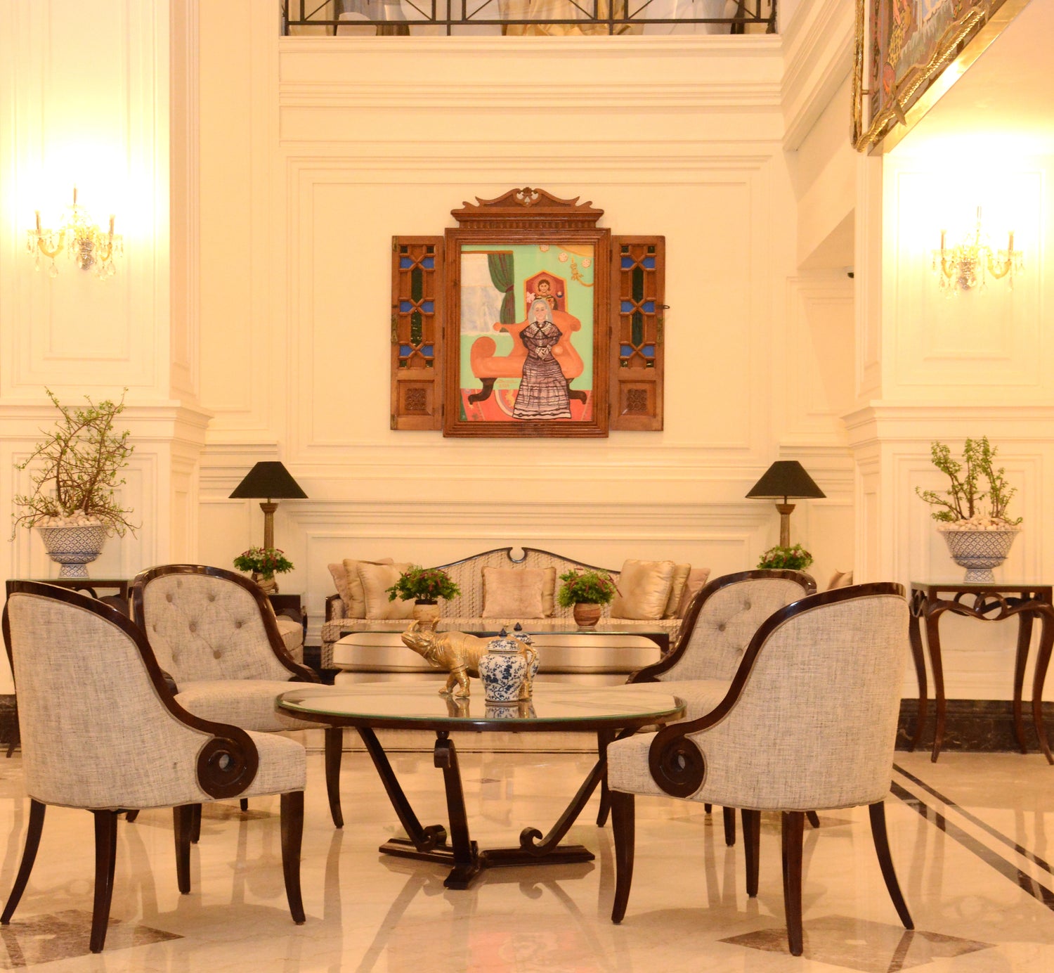 The two paintings mirror one another subtly. Chandeliers are split in half across the canvases, leaving it deliberately unclear whether the figures sit side by side or across the room from one another. This ambiguity invites the viewer into the space between them- where long marriages, shared silences, and unspoken tenderness reside. Flowers, a small footstool, a chair angled just so- each detail contributes to a sense of lived-in calm.