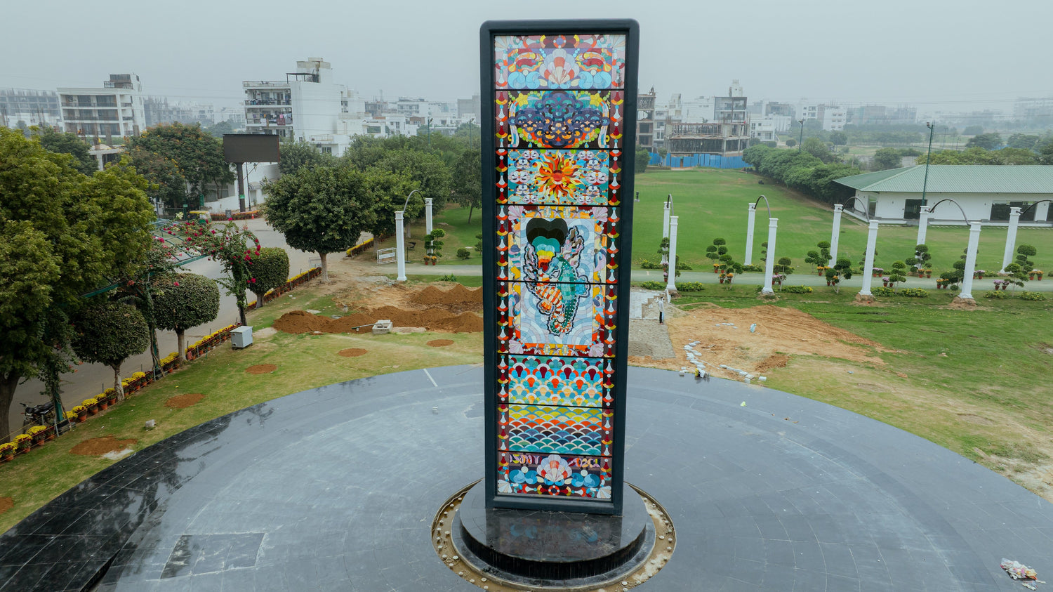 Installed above water at Central Park, Flower Valley (Sohna, south of Gurugram, India), the piece responds continuously to light, shifting through the day and glowing after dusk. Fragile in material yet architectural in presence, it affirms stained glass as a living, contemporary medium.