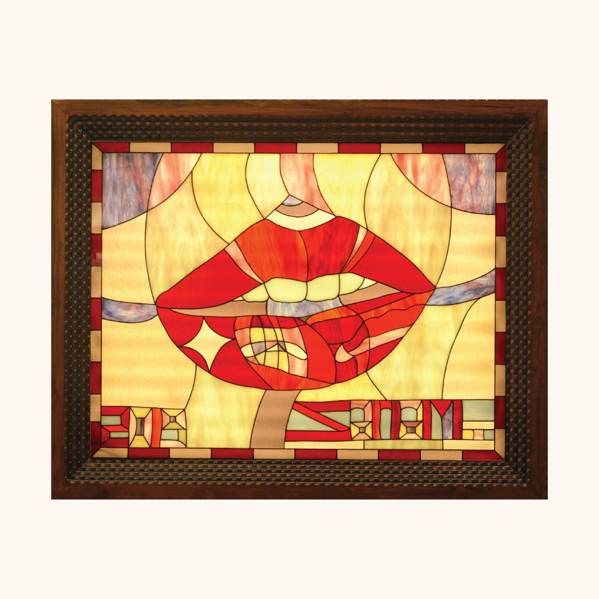 Lip Service is a series of six stained- glass works, two of which were acquired at the India Art Fair, exploring seduction, silence, and the tension between adornment and voice. Rendered with couture- level precision, each panel meditates on female desire and the unspoken, using hand- selected shades refined through repeated digital and physical trials. What appears bold and pop reveals, on closer view, an obsessive feat of craftsmanship: dozens of individually cut glass fragments resolved into breathing compositions of colour, mythic symbolism, and engineered light.