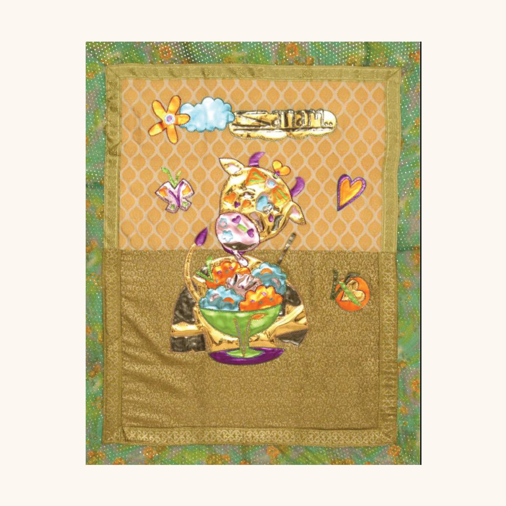 Hand- stitched on sacred Indian fabrics, this work gently subverts the cultural iconography of dairy, returning the cow’s body and innocence to her. The pastel whimsy contrasts with the realities of modern dairy systems, transforming a simple dessert into an ethical, spiritual metaphor.