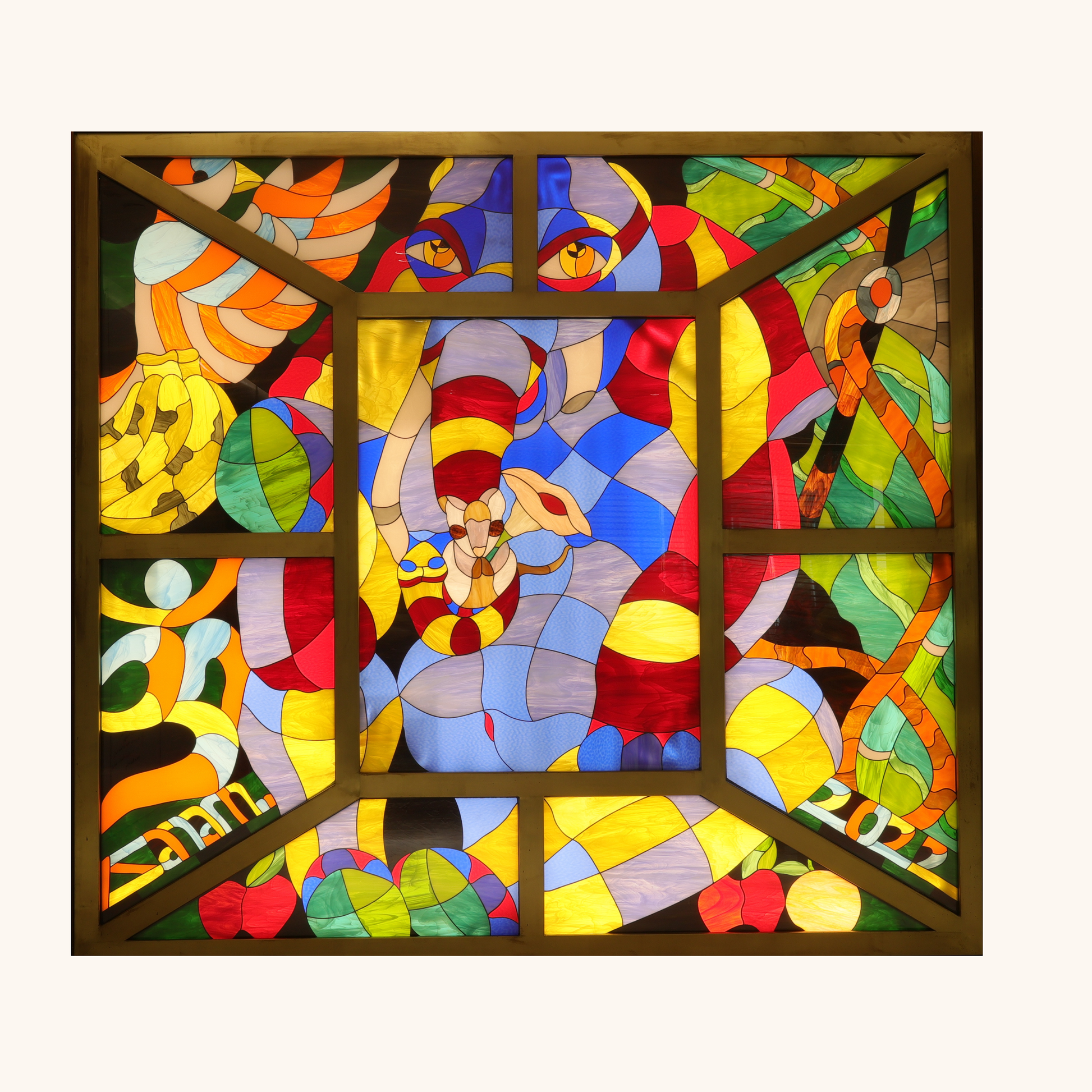 A vibrant interplay of light, color, and sacred symbolism, this stained glass installation portrays Lord Ganesha through a contemporary abstract form. The composition merges spirituality with modern design transforming traditional devotion into a luminous art experience.