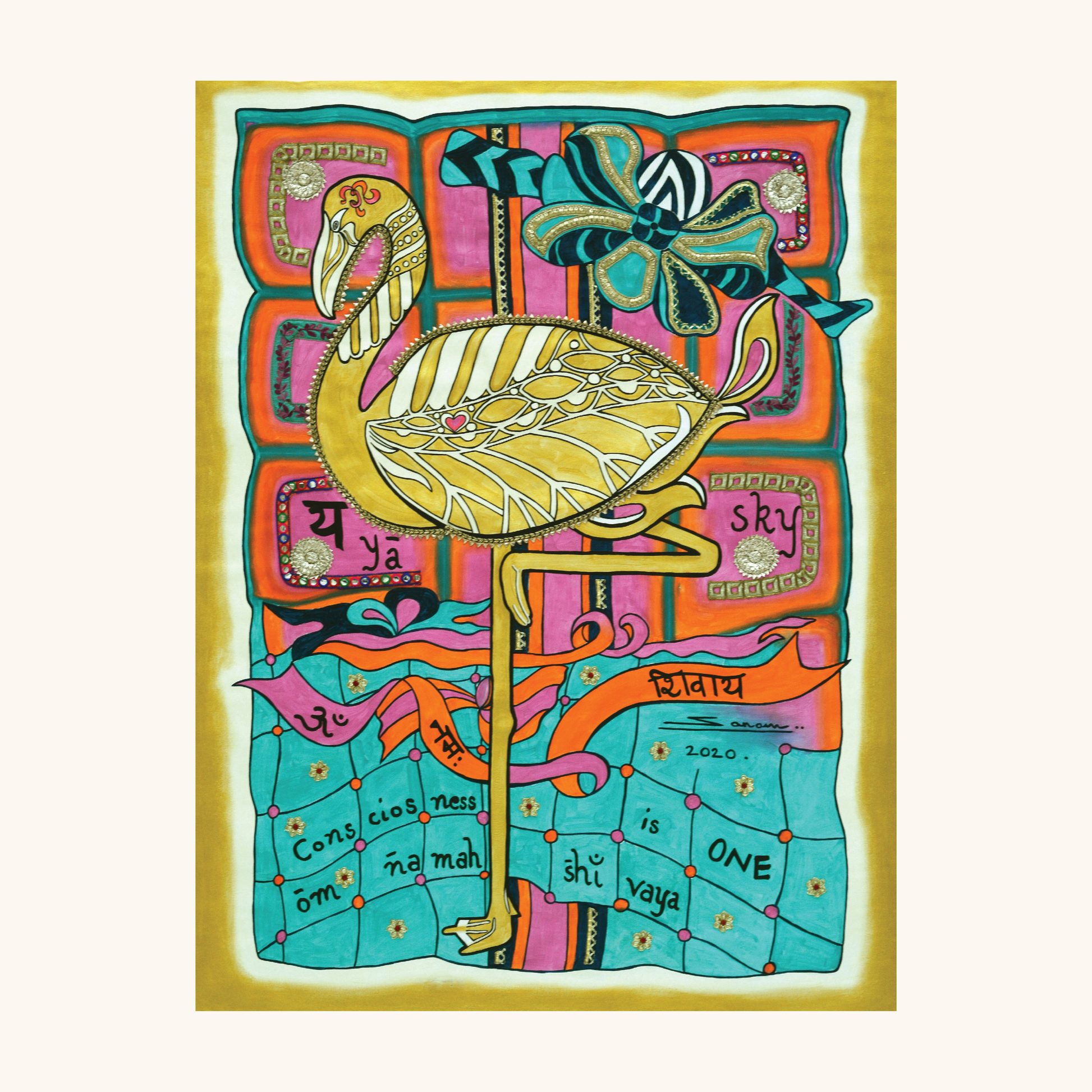 Mrs. Yin Stilts, carrying Ya, the sky (from Om Namah Shivaya), wears a ribbon- bow that doubles as a playful marker of consciousness, signalling her sentience. Her soft colours and cut- out geometry speak to the delicacy of nature and the quiet luxury of seeing animals as beings, not ornaments.