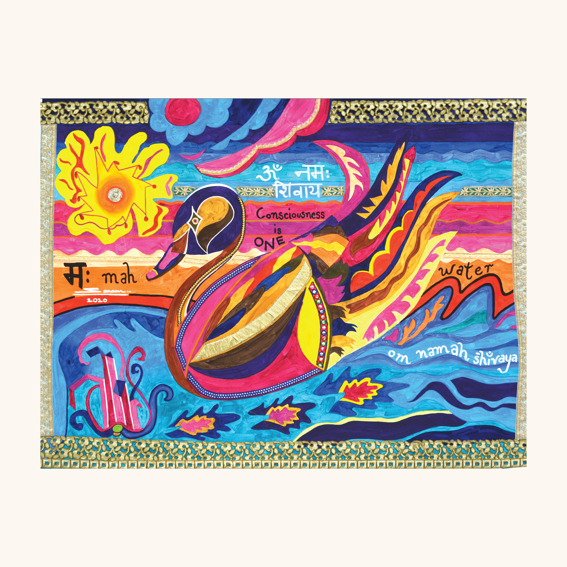 Representing Mah, water (from Om Namah Shivaya), Ms. Ruffles floats through sunbursts, seaweed shaped like harps, and feathered geometric patterns. Named with warmth, she embodies innocence, rhythm, and the beauty of perceiving animals as divine creations rather than possessions.