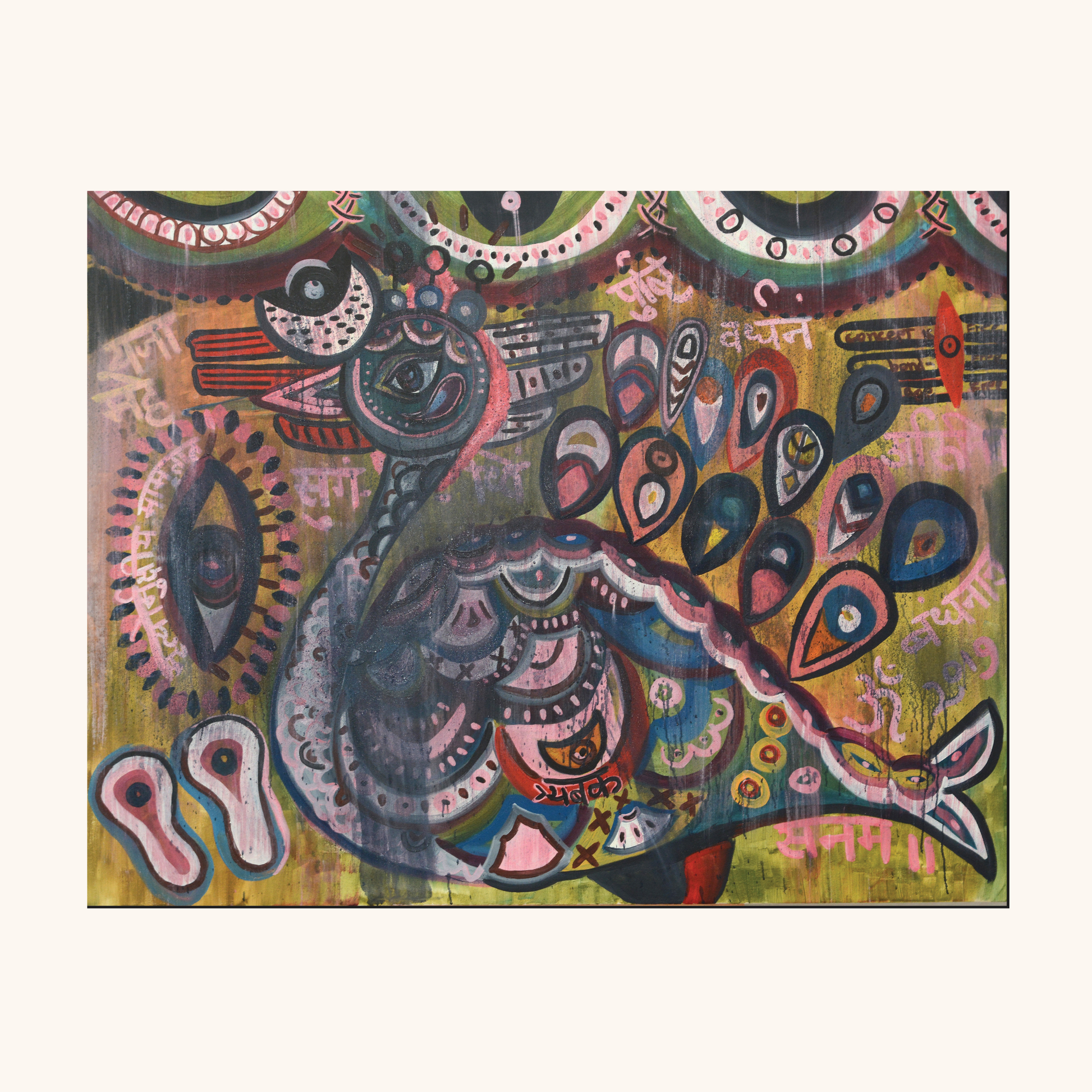 Parvani glows with layered blues, greens, and controlled splashes. The background remains clean and luminous, a deliberate contrast to Vasuki’s urban grit. This mirrors India’s cultural bias: the peacock is adored and aestheticised, celebrated for its beauty, while the serpent is avoided despite equal spiritual stature. The splashes here act not as vandalism but as a nod to contemporary visual culture, how beauty is framed, stylised, elevated. Parvani stands as a symbol of selective reverence: worshipped in myth, admired in ornament, yet juxtaposed with the lived reality of neglected street animals outside temple gates.
