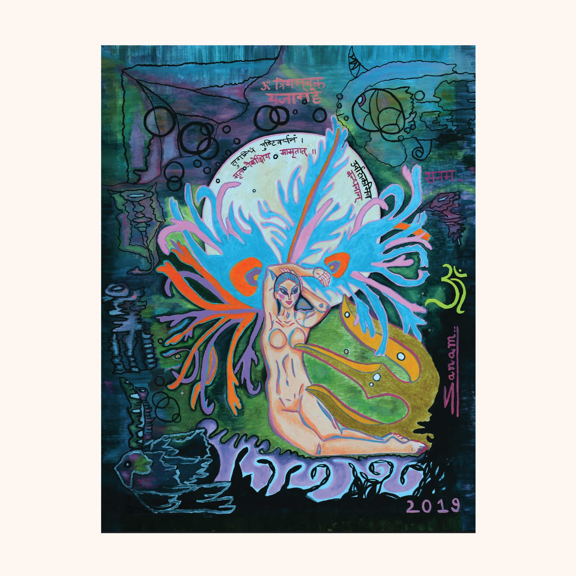 Parvati appears both underwater and celestial, crowned with feathers and anchored by bioluminescent tendrils. Her eyes, sly, intelligent, aware, meet the viewer with a quiet seduction. A neon yellow- green ॐ radiates behind her like a living aura. The trishul points directly toward her heart, mirroring Shiva’s, a visual truth that divinity is shared. Delicate lace- like textures and layered paintwork place her between goddess, muse, and elemental force. She is the feminine principle in its full autonomy: intuitive, powerful, equal.