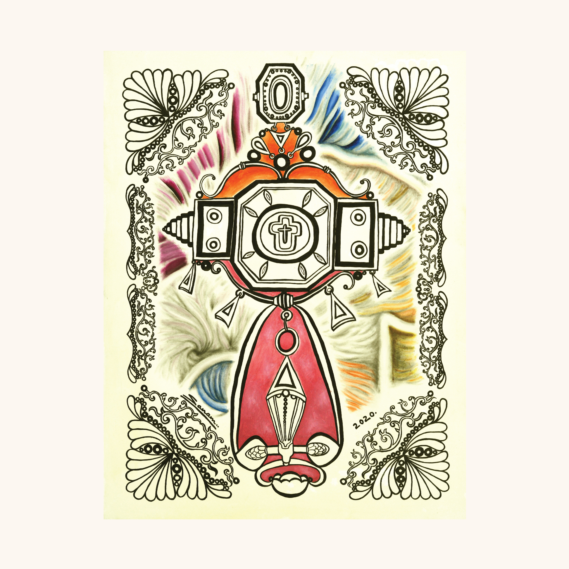 Every canvas is embedded with hand- picked Indian textiles, chosen like small relics of devotion- cloth that once touched human hands, markets, households. The cross becomes an object of contemplation, not to convert anyone, but to shift the energy of a room: a reminder that the self is one, that innocence must be protected, and that beauty itself can be a door to stillness.