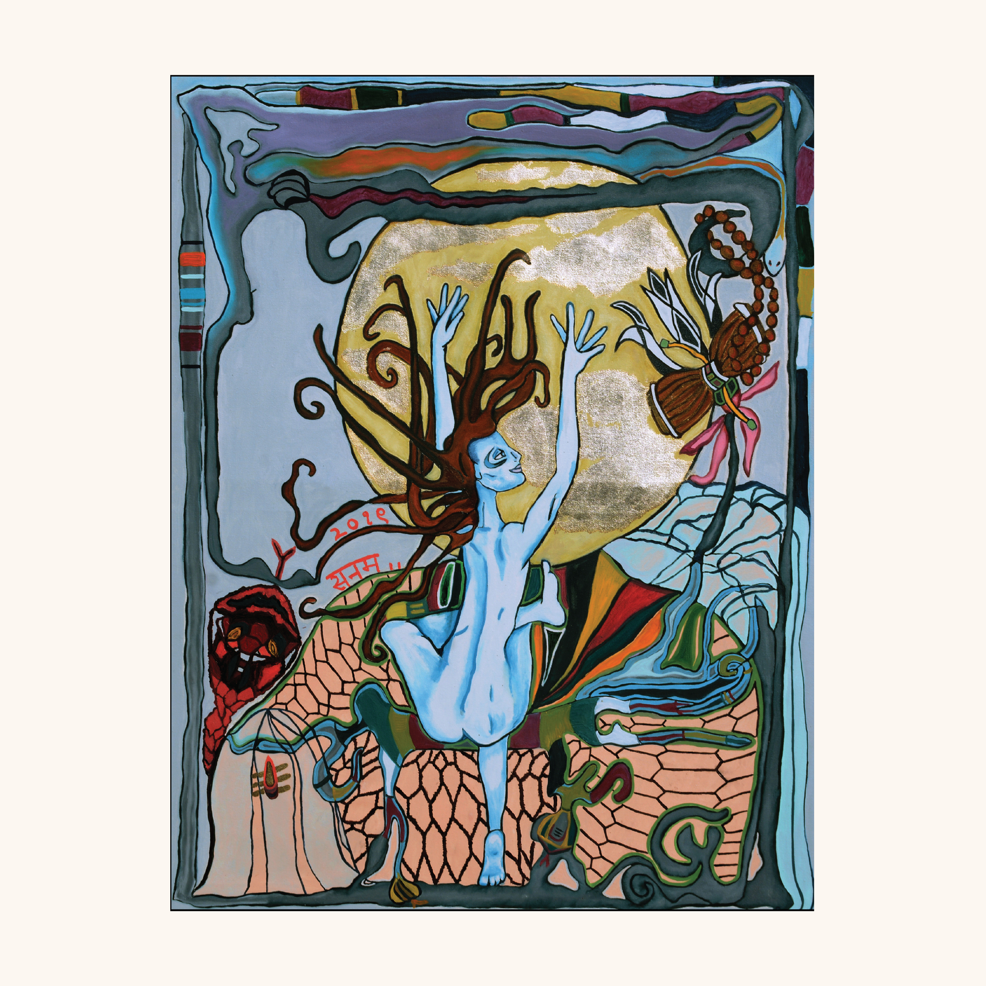 Shiva sits surrounded by fog that twists like living sinew, the atmosphere charged with moonlit energy. His dreadlocks fling outward in wild rhythm, his dumroo pulses, and the original lingam rises beside him as the axis of creation. The full moon behind him is covered in silver leaf, glowing like a doorway to his pure consciousness. Vasuki’s colours shift between serpent and cloud, flowing through deep jewel tones that echo the richness of sacred ornament. The mantra curves across the moon, whispering its ancient plea: