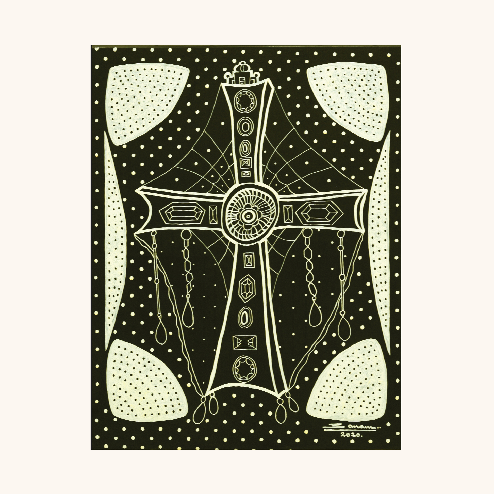 Spotty Dottie resembles a bridal veil, its dotted white field framing a cross that is both ornament and invitation. The restrained palette highlights the structure, clean, graphic, ceremonial. The piece plays with the idea that surrender is not dramatic but surprisingly gentle, like lifting a veil and finding that the seeker and the sought are the same.