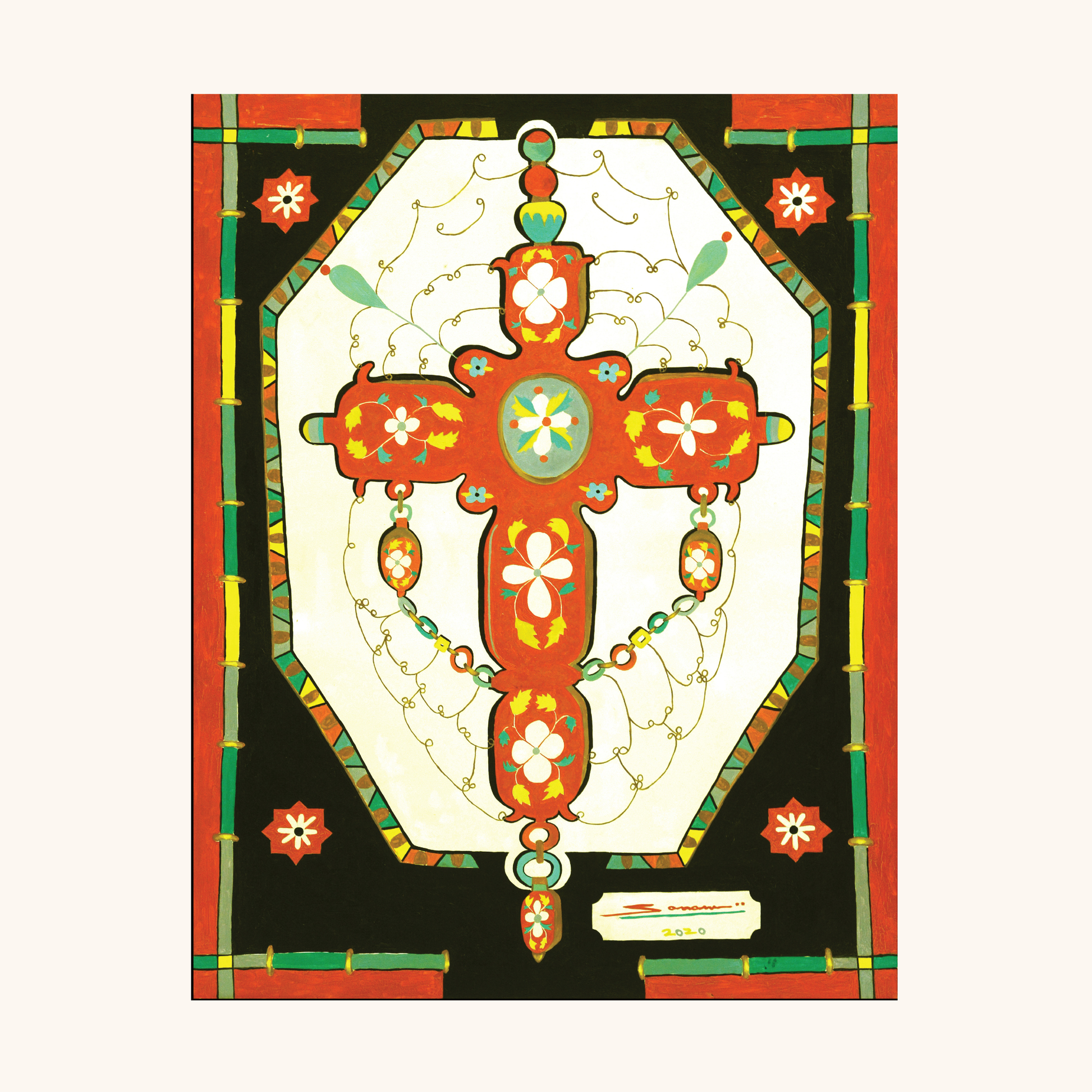 A bright bubblegum- pink cross alive with looping forms, Squiggle draws on the delicacy of jewellery, filigree, chains, tiny pendants, translated into paint. The side borders echo bamboo bangles, playful yet architectural. It embodies the artist’s belief that surrender isn’t solemn; it can be joyful, ornamental, even childlike, while still pulling the viewer into a deeper quiet.