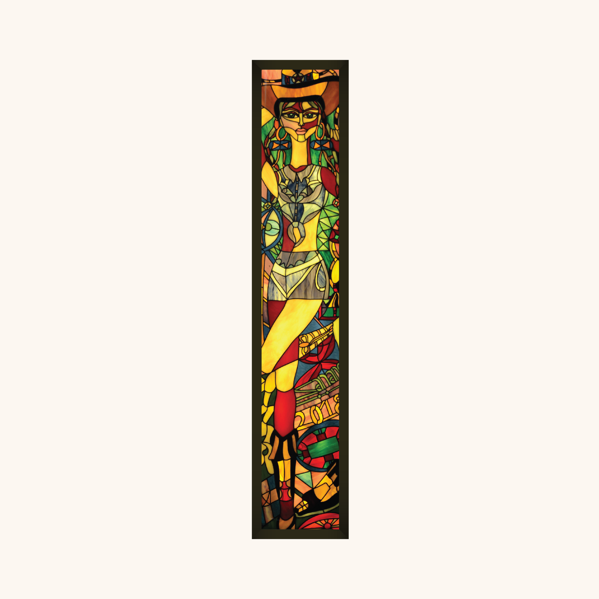 Her hat, boots, braided hair, and meticulously detailed pockets become icons of self- possession, while the Aztec motifs behind her evoke ancient cosmologies. The Cowgirl stands as a bold fusion of mythology and Americana through the prism of stained light.