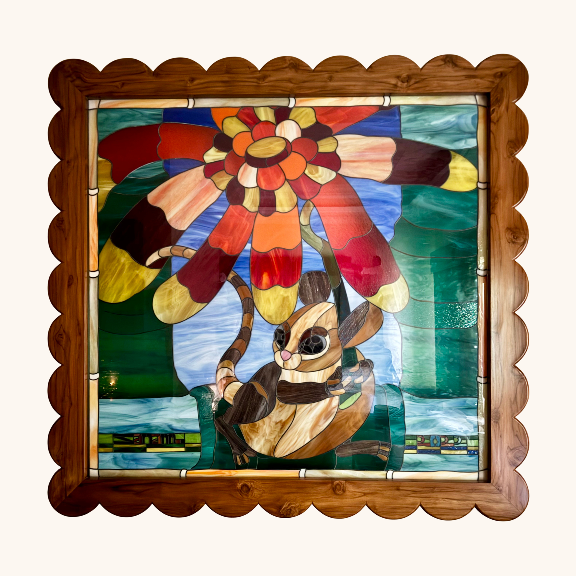 A small field mouse finds shelter beneath an oversized flower, each petal shifting through subtle, non- repeating yellows and oranges. An ombré tail curls beneath it, a feat of nuanced colour- grading in glass. The mouse’s expression is soft and watchful, shaped by precise cuts around eyelids, nose, and whisker line. It feels like a fragment from a forgotten storybook- lifted into architectural scale, glowing with quiet wonder.