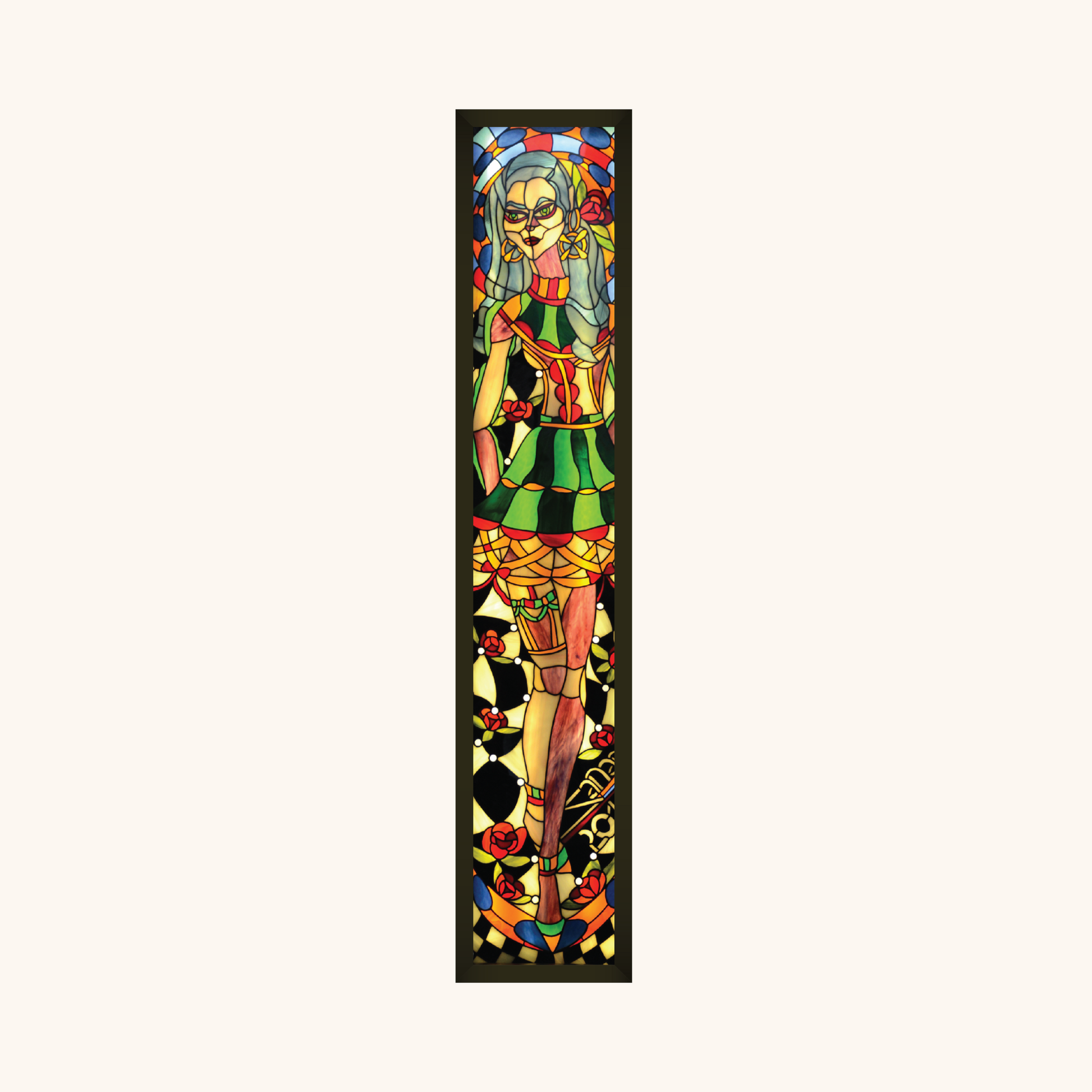 Las Chicas is a celebration of the divine feminine rendered through the luminous discipline of stained glass- a medium whose very limitations demand devotion. Each narrow, doorway- like panel compels the artist to work in exquisitely small shards, creating women whose confidence, sensuality, and spirituality glow through the fragmented mosaic of colour and light.