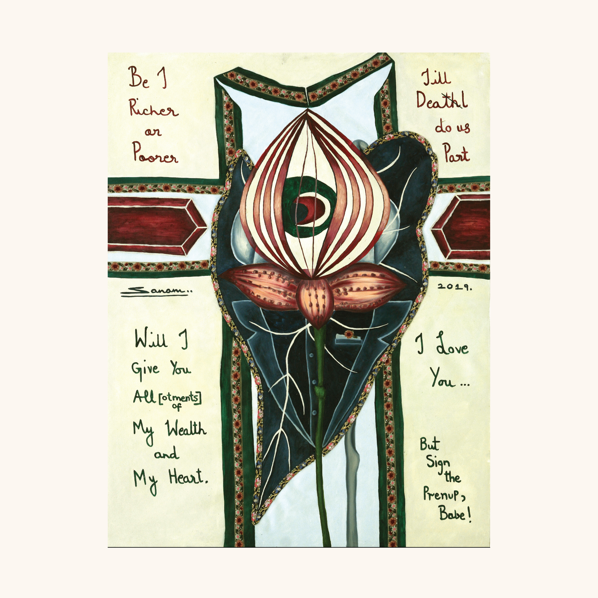 He stands as a lotus- headed groom in a leaf- formed tuxedo, his single eye alert, a man negotiating love and provision at once. His form is stitched with the same family of traditional- contemporary textile trim seen on the Bride, including accents along the leaf edges and across the cross behind him. His vows are equally revealing: