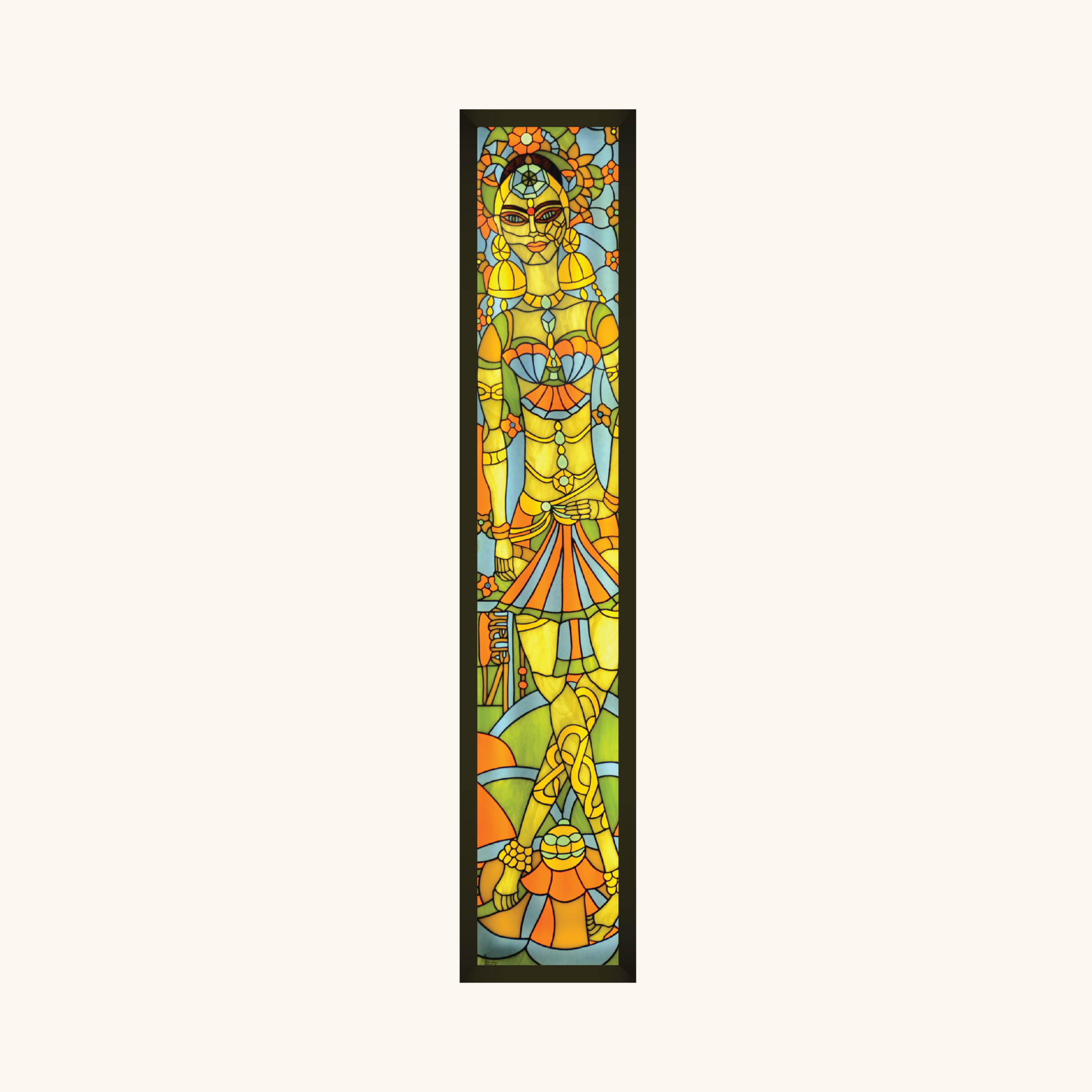 Las Chicas is a celebration of the divine feminine rendered through the luminous discipline of stained glass- a medium whose very limitations demand devotion. Each narrow, doorway- like panel compels the artist to work in exquisitely small shards, creating women whose confidence, sensuality, and spirituality glow through the fragmented mosaic of colour and light.