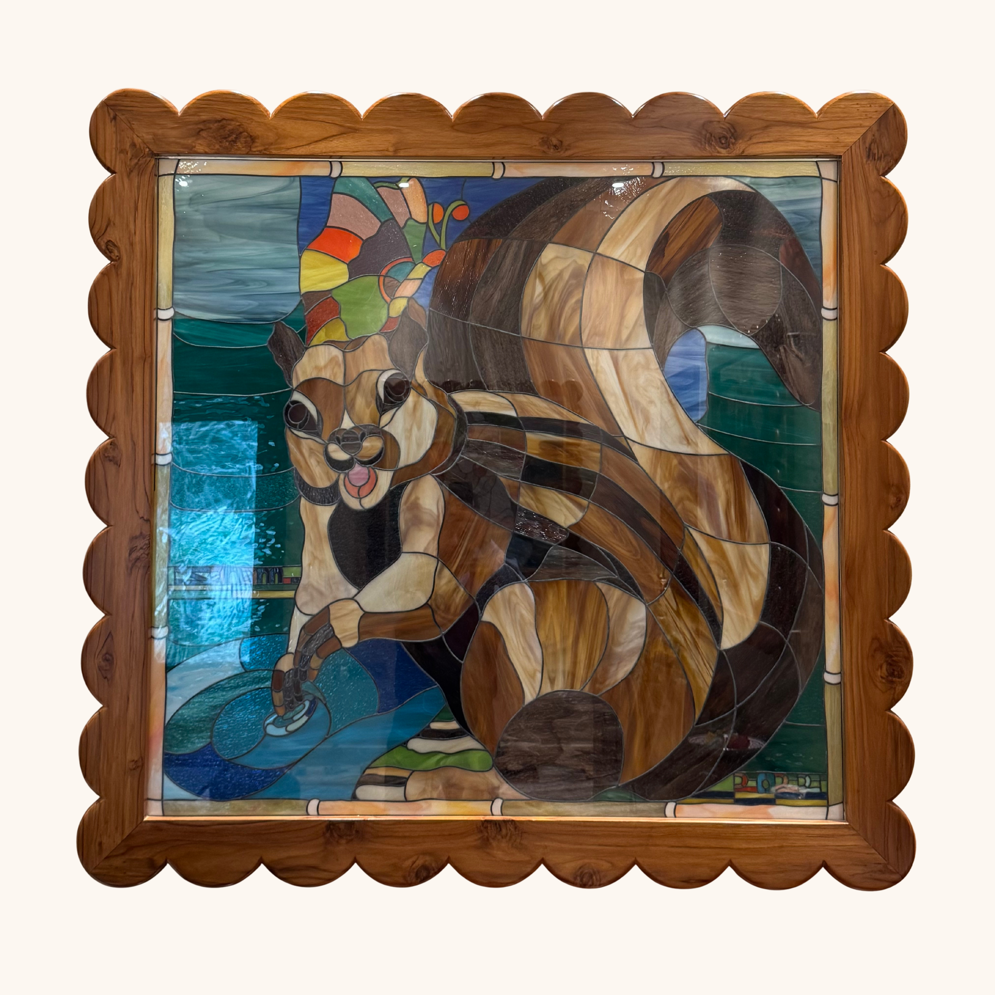 Bright- eyed and mischievous, the squirrel dips its tiny hands into swirling blue water. The surrounding turquoise- textured panels form a bamboo- inspired border, adding reflective depth and playful elegance. Its fur, constructed from dozens of precisely cut glass facets, shifts through winter browns, chocolate tones and soft golds. The butterfly perched behind its head adds a whisper of humour, a fleeting woodland moment captured mid- breath, alive with curiosity.