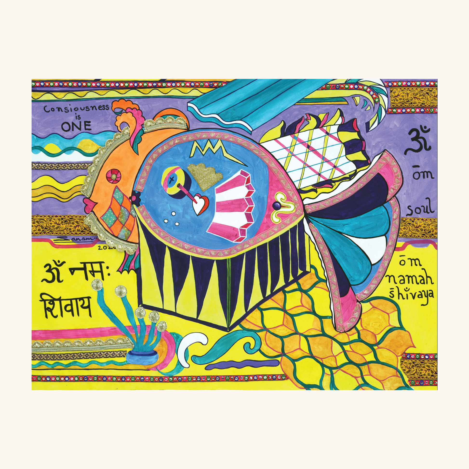 With Om, the soul (from Om Namah Shivaya), Zigzag is named with affectionate playfulness, its telescope- like eye pointing directly toward its heart to show the creature’s capacity for feeling. Couture- like geometry, layered patterns, and sewn textures turn this fish into a living, breathing jewel of the waters.